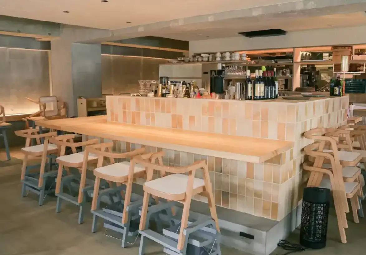モダンな内装の飲食店に合う色の白い一枚板のカウンターを調達から加工までさせていただきました。