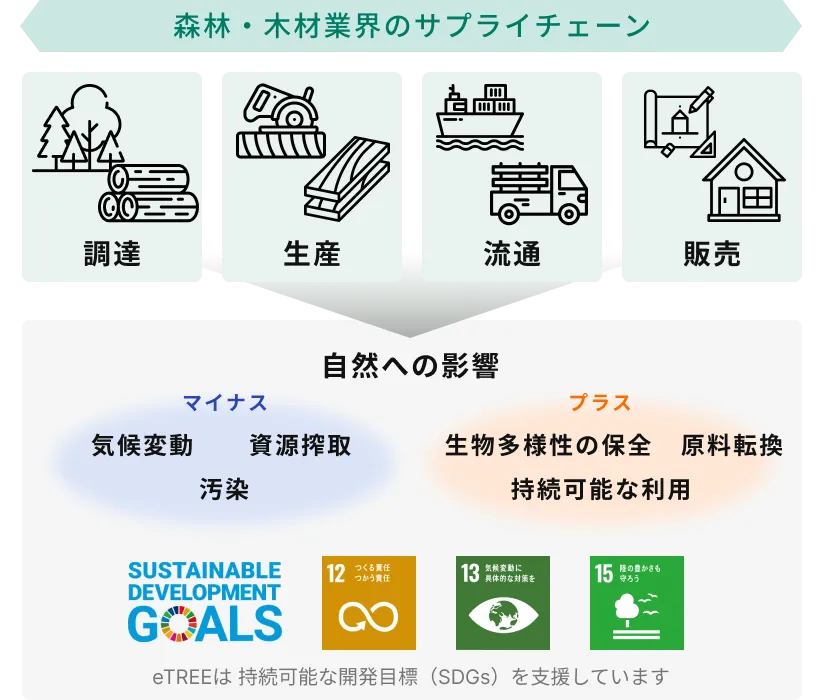 森林認証の取得により、環境配慮やカーボンニュートラルへの貢献が可能となり、SDGsの目標達成にも寄与します。特にFM認証は生態系への配慮も確認されており、2030年のネイチャーポジティブ実現に貢献できます。