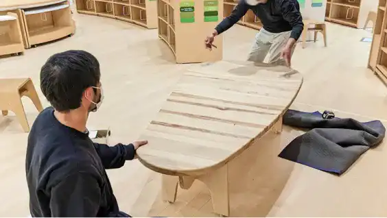 eTREEの「伐採木活用支援サービス」では、建設予定地の既存樹や倒木の恐れがある街路樹など、伐採せざるを得ない樹木の活用をご支援します。これらの樹木は廃棄されることも多いですが、土地の歴史や地域の人に愛されていた想いを汲み、家具や什器、建材、オブジェなど別の形に生まれ変わらせることもできます。