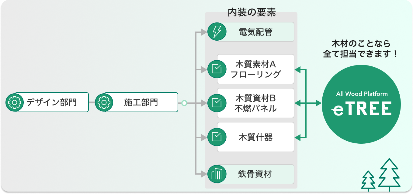 木材のことならなんでも対応できるのがeTREEの最大の強みです。全国の材木事業社のネットワークと木材専門の知識を活かし、あらゆる木材加工の実現をサポートいたします。また、従来であれば各事業者に見積もりを依頼していた煩わしさがeTREEによって解決できます。