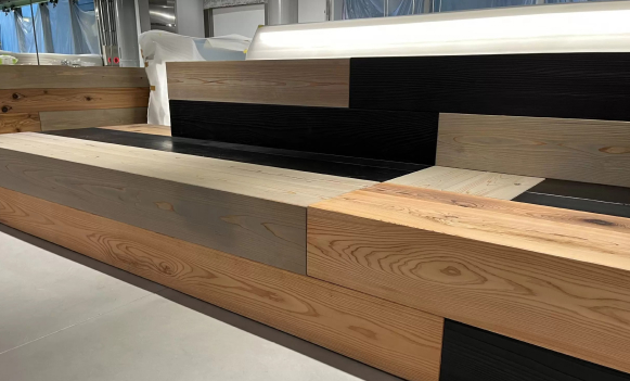 3パターンの表面仕上げをしたスギ角材を積み上げた巨大な木製ベンチ です。材提案からデザイン調整を経て、200mmのスギ材の調達と各種加工とを限られた納期で行うという、当社でもチャレンジングな案件でした。無事納品したベンチはご依頼主様にもお喜びいただけました。